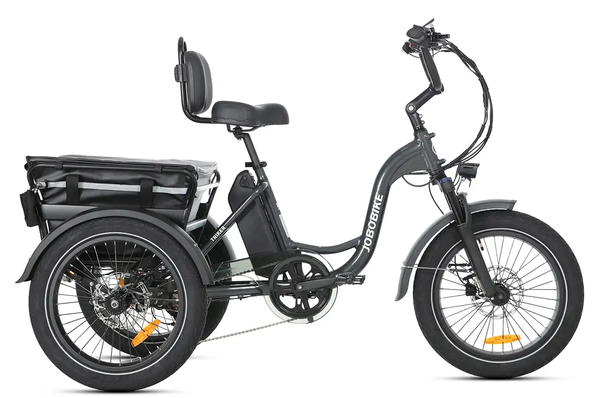 Le Tricycle JOBOBIKE est un tricycle cargo électrique stable et polyvalent, parfait pour le transport urbain et rural, offrant sécurité et confort aux seniors et débutants.